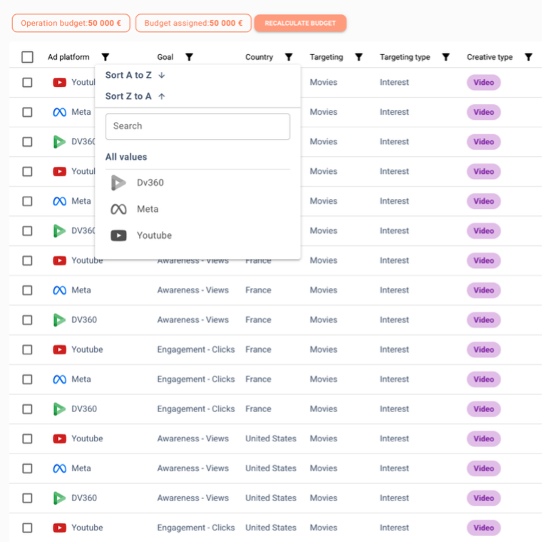 Filters are available to select each dimension, allowing adjustments to the structure in order to achieve the perfect setup and the right starting budget per targeting.